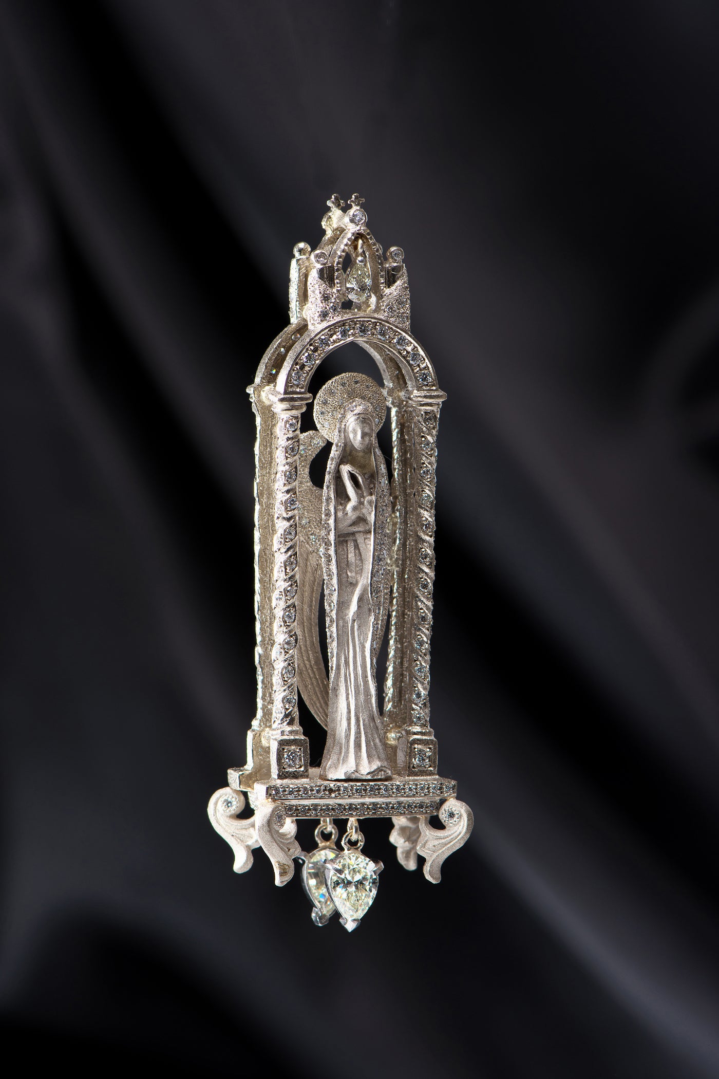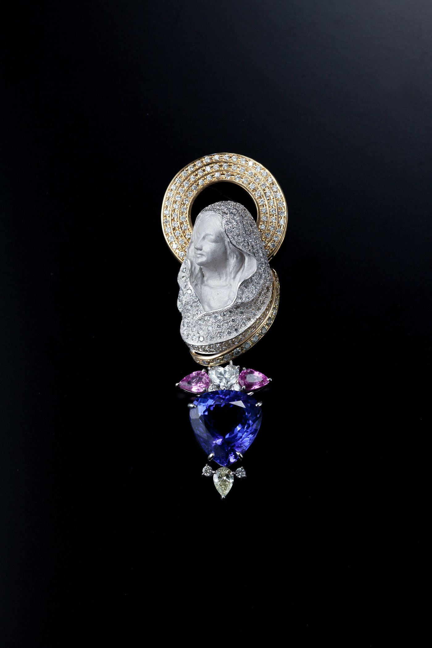 宝飾品作家45周年記念制作として作られたマリア様。角江のマリア様は自身の心の中にある愛を形に表現したもの。制作当時75歳を迎えた角江の人生観が、マリア様の表情によく表れている。タンザナイトの石言葉『高貴な人』かピッタリと当てはまり、宝石の放つ輝きと、マリア様のオーラが合わさった神秘的な魅力が感じられる作品。
