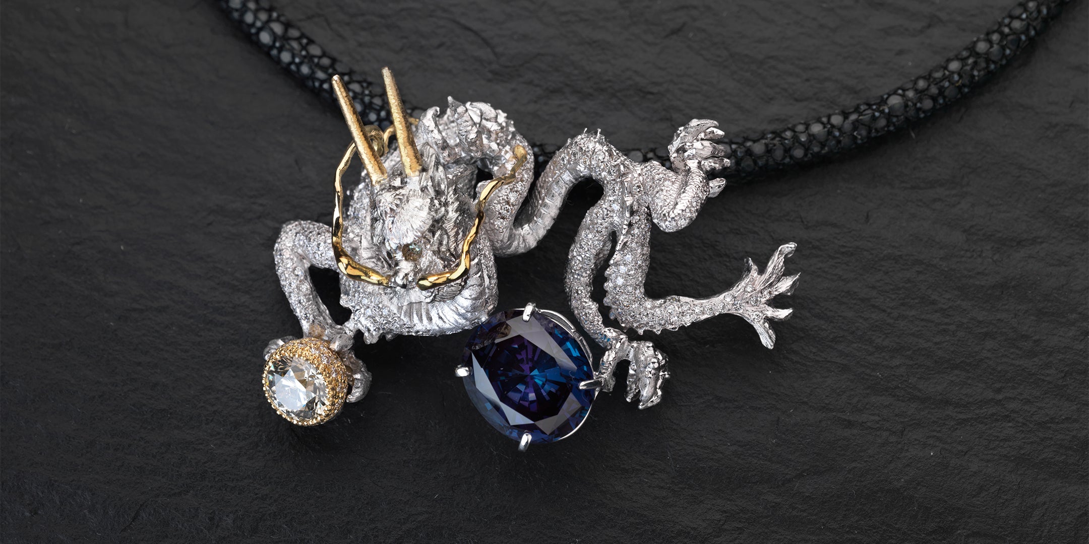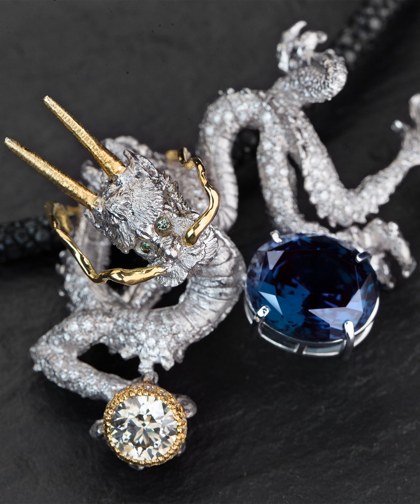 龍は空想上の生き物でありながら日本古来から五穀豊穣を願う神様として親しまれてきました。匠、角江千代治は、その龍の体にwhite goldを使用。角にはyellow goldで立体感を出し左手には3キャラットの天然ダイヤモンド。左手には再結晶宝石の大粒アレキサンドライトを持たせ、角やひげには金種の組み合わせた蝋付という熟練した匠にしかできない技を使っています。鱗の一つ一つを彫刻するのにかなりの時間を費やし、手仕事ならではの迫力ある作品に仕上げました。この作品は角江千代治作品の中でも最大級のものです。