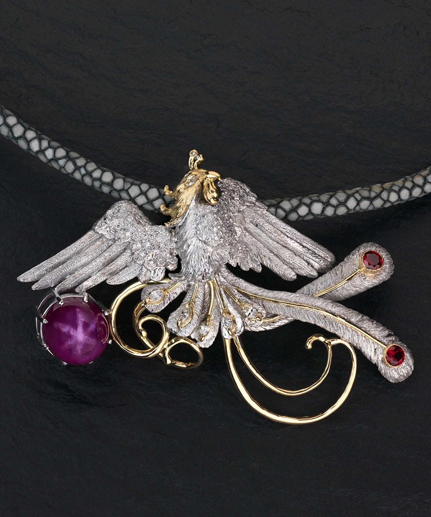 中国神話の鳥「鳳凰」は徳の高い君子が天子の位につくと出現する、めでたい鳥と考えられている。その鳳凰を角江千代治がペンダントにデザインし彫刻した作品。平和の象徴として縁起の良い鳥とも語り継がれており、人々の心の中に幸せをもたらす神の使いのような存在である。本作品は角江作品の中でも最大級のものと言え、羽根の一本一本を丁寧に彫刻し、いくつ粒ものメレダイヤで軽やかさと優雅さが表現されている。
