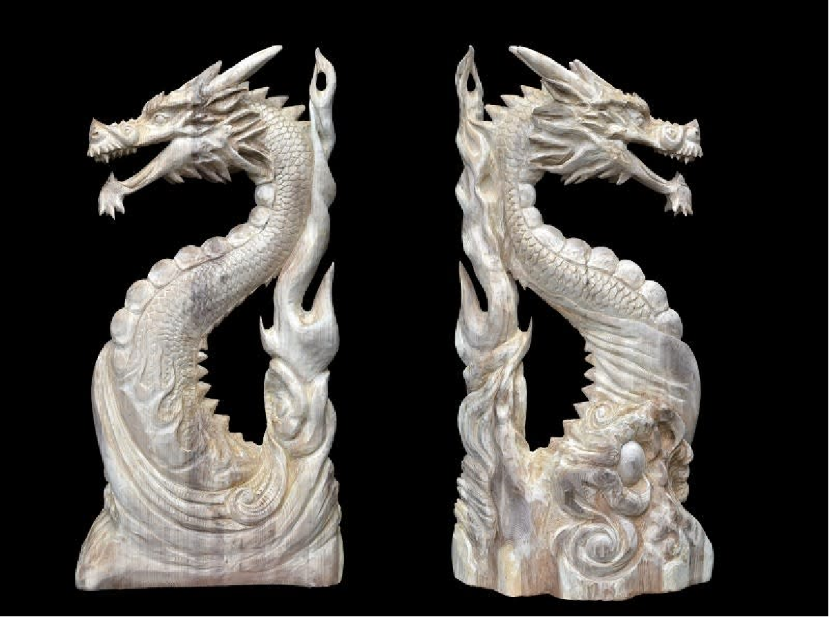 辰年に、願いを込めてこの龍を彫りました。 龍は水の神様として知られますが、私はそれ以上に、火や風、空気など自然のすべてを司り、私たち生命体の根源を支える存在だと信じています。 全ての生き物の親である龍の愛は、人間だけでなく、生きとし生けるものすべてに届くものです。 どんな命も区別されることなく、等しく愛される。そんな平和な地球であってほしいという祈りを、この作品に託しました。