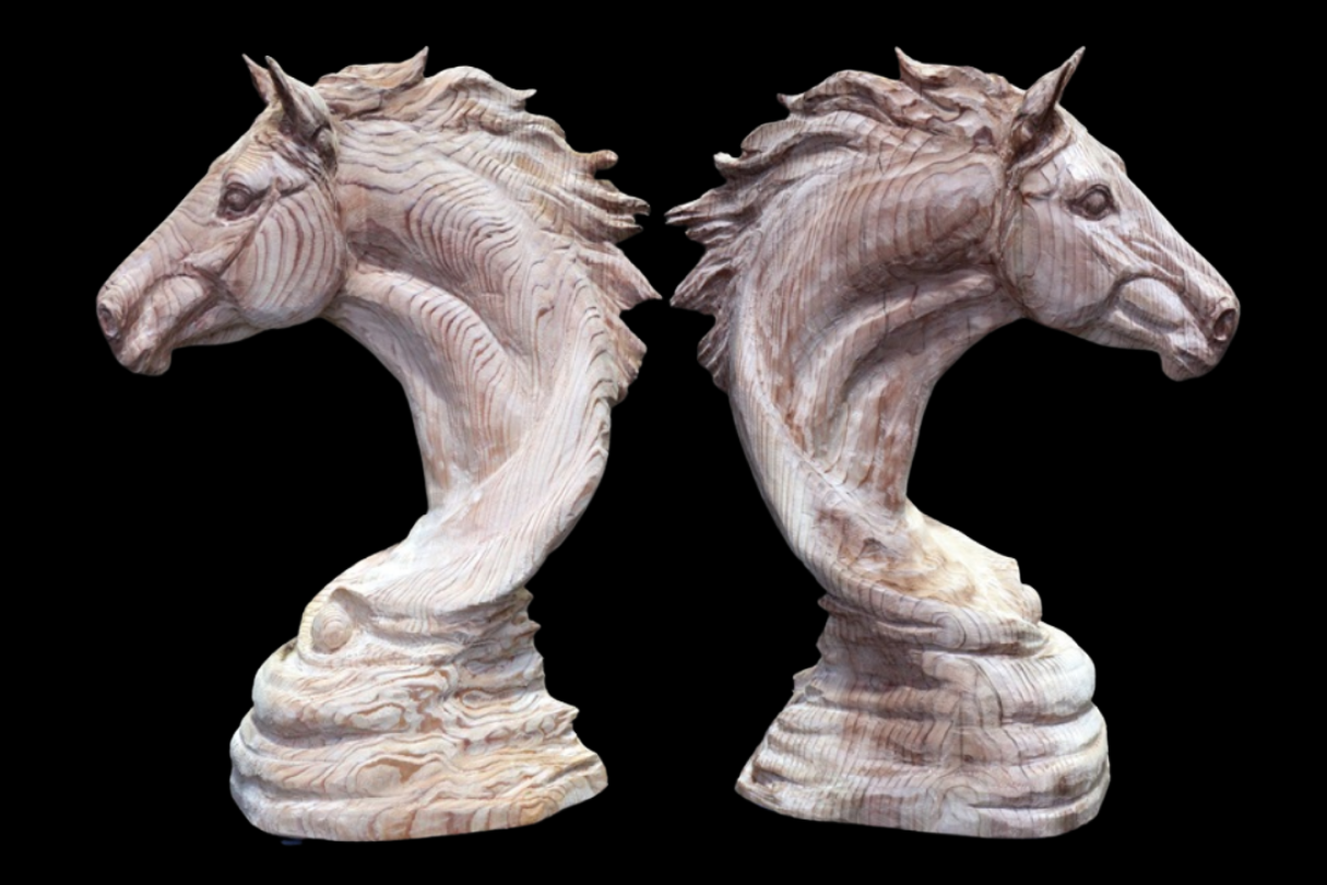 目に見えない風のうねりを、木という確かな生命に宿した作品です。台座から頭部へと駆け上がる曲線は、大地の脈動と空への憧れを表現しています。。荒々しくも繊細な彫り跡は、吹き抜ける風の軌跡。静止した木塊の中に、今まさに駆け出そうとする「颯(はやて)」の鼓動を感じてください。