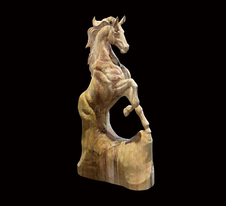 木に宿る魂が馬のかたちを借りて現れたような神秘性を込めて。和歌山県龍神村の森の中、長い時を刻んだ杉の木をチェンソーを巧みに操り、躍動感のある馬を彫りだしました。縄文時代の遺跡から杉の丸太舟が発掘されるなど古代から私たちの生活に深く根ざしてきた杉の木その唯一無二の美しい木目と質感を生かし今にも駆け出しそうな生命感あふれる馬となりました。
