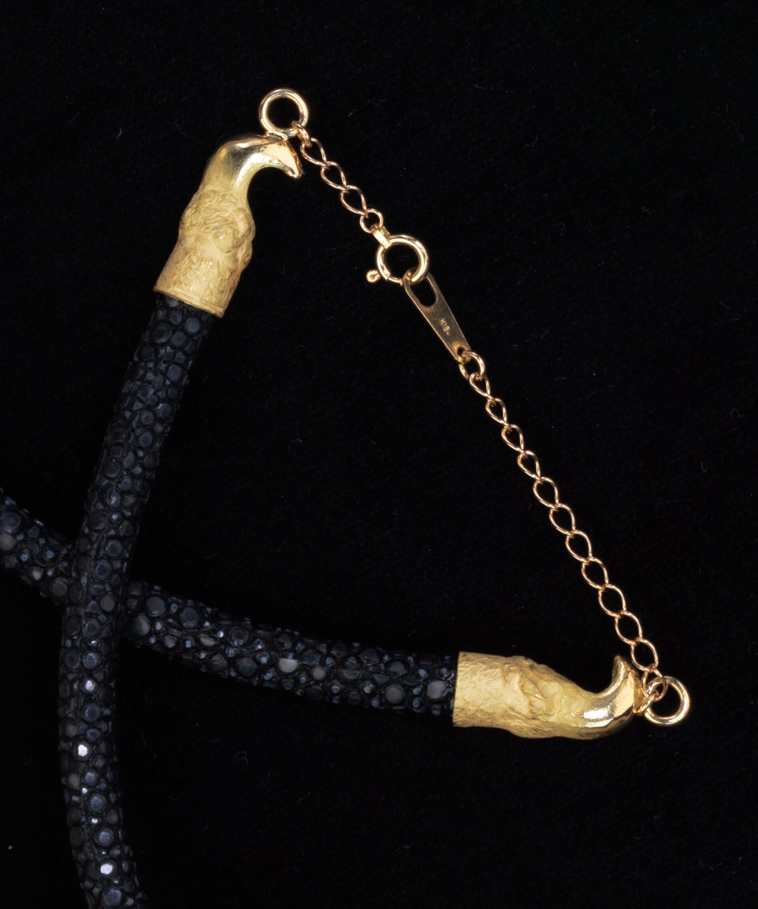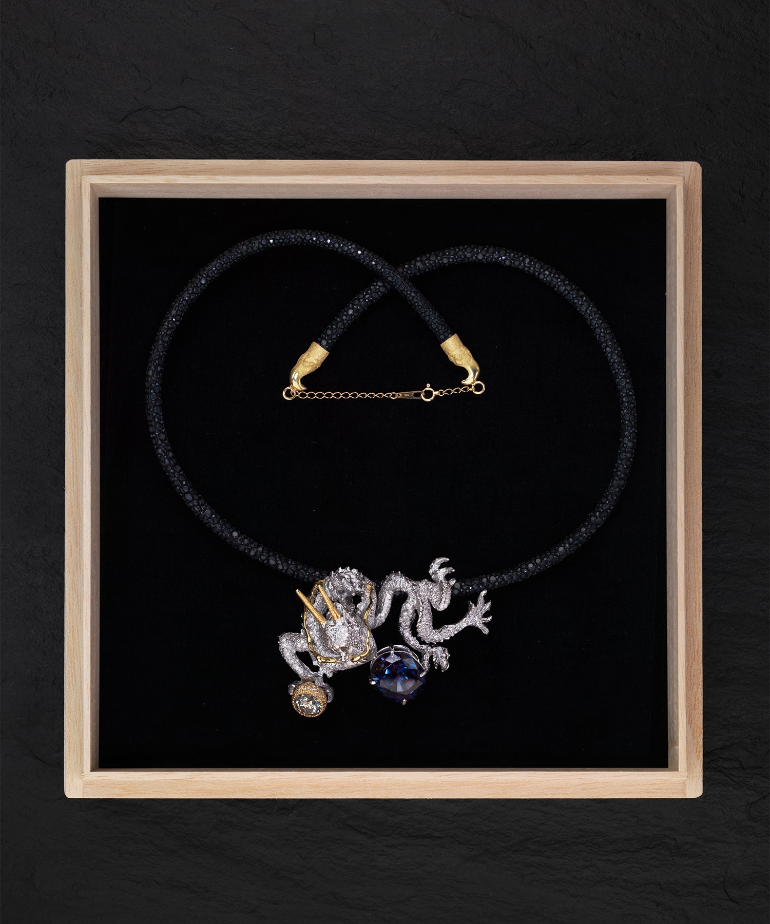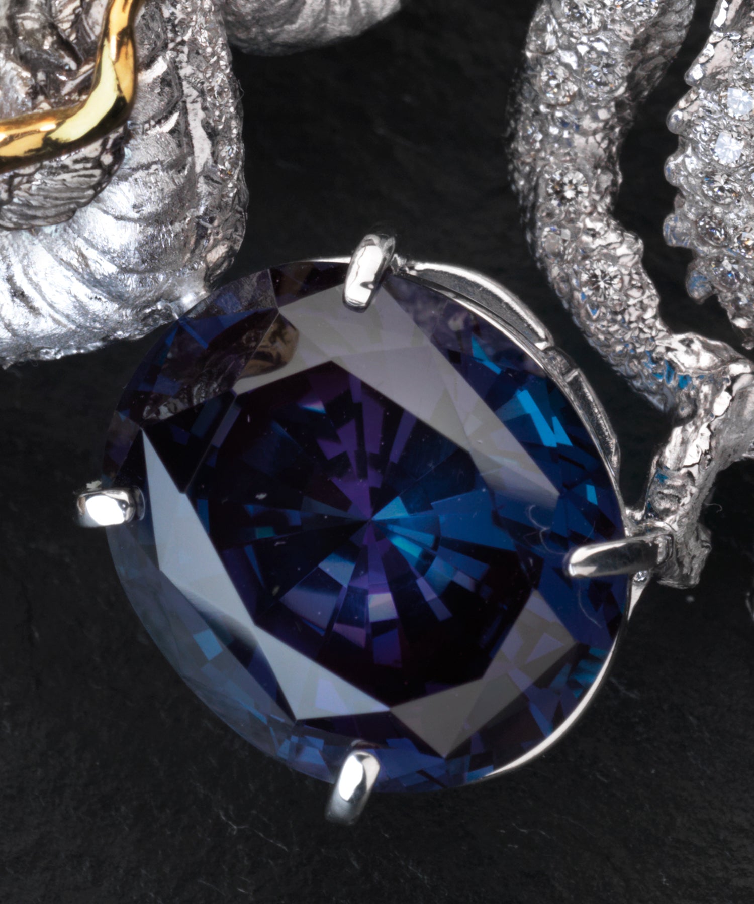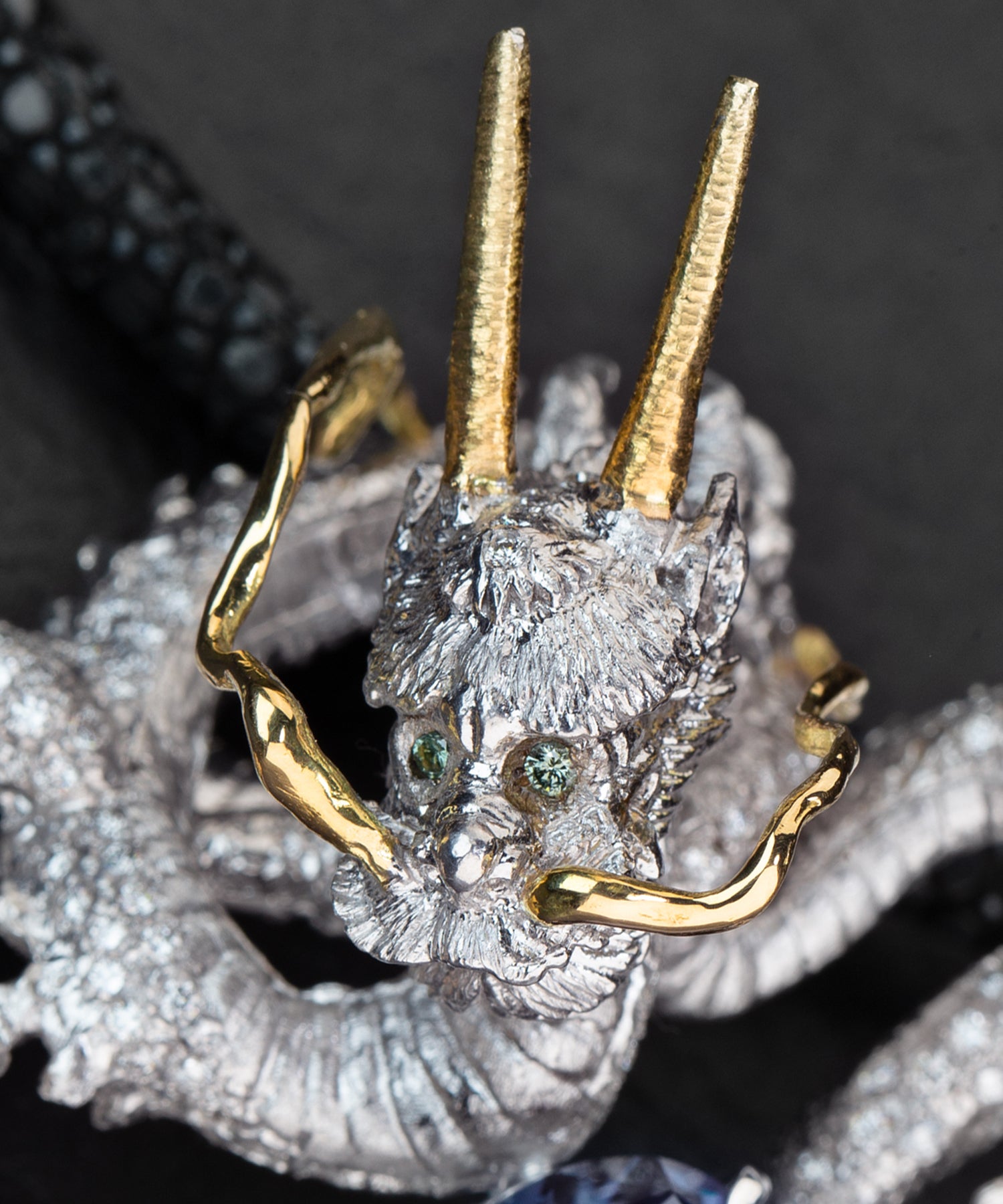 龍は空想上の生き物でありながら日本古来から五穀豊穣を願う神様として親しまれてきました。匠、角江千代治は、その龍の体にwhite goldを使用。角にはyellow goldで立体感を出し左手には3キャラットの天然ダイヤモンド。左手には再結晶宝石の大粒アレキサンドライトを持たせ、角やひげには金種の組み合わせた蝋付という熟練した匠にしかできない技を使っています。鱗の一つ一つを彫刻するのにかなりの時間を費やし、手仕事ならではの迫力ある作品に仕上げました。この作品は角江千代治作品の中でも最大級のものです。